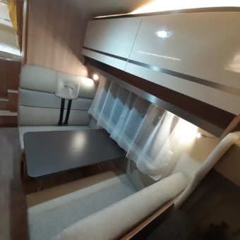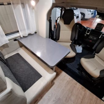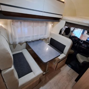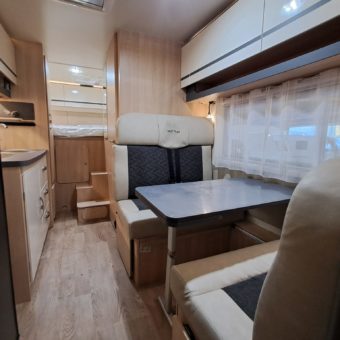 Autocaravana compacta y muy bien aprovechada, con seis plazas y una distribución práctica que incluye doble dinette convertible, cama frontal con somier de láminas y una nevera trivalente de gran capacidad.