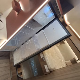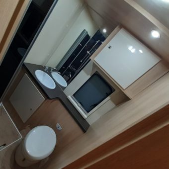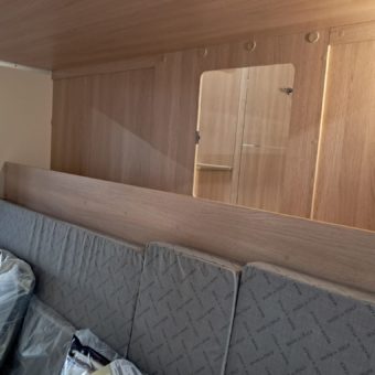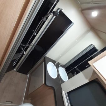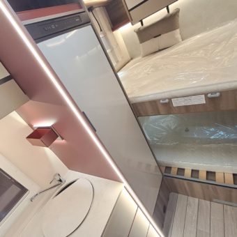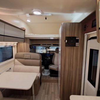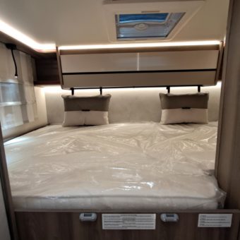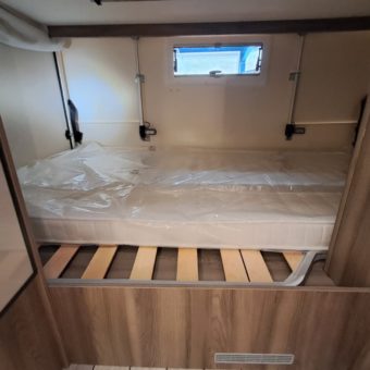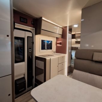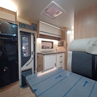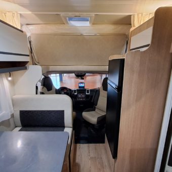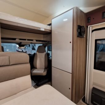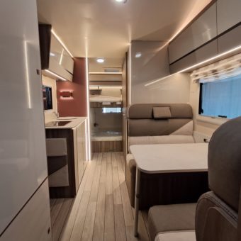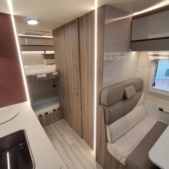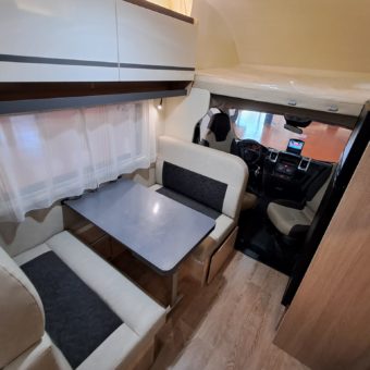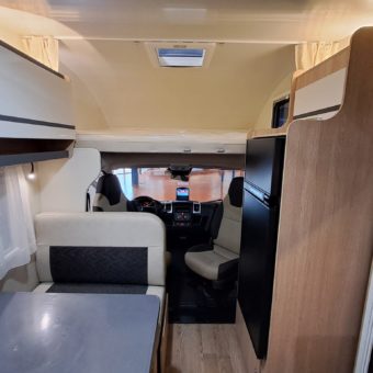 Autocaravana capuchina amplia y muy práctica, con seis plazas homologadas para viajar y capacidad de hasta ocho personas para dormir, gracias a sus literas dobles y a la gran cama situada sobre la cabina.
