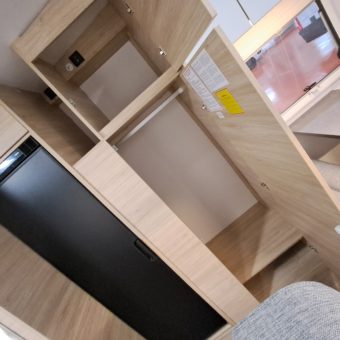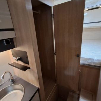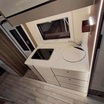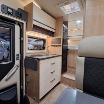 Autocaravana compacta y confortable, con cuatro plazas y una distribución práctica que incluye dinette central convertible, cama frontal con somier de láminas y una nevera trivalente automática.