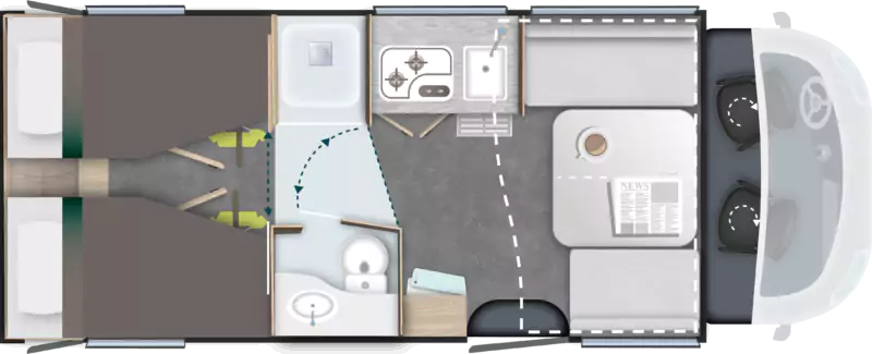 El salón enfrentado crea una sensación de espacio muy superior a otros modelos de su categoría. Permite sentar cómodamente hasta 5 personas y se convierte en el corazón de la autocaravana.