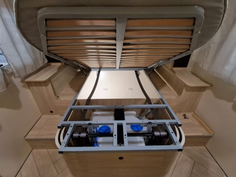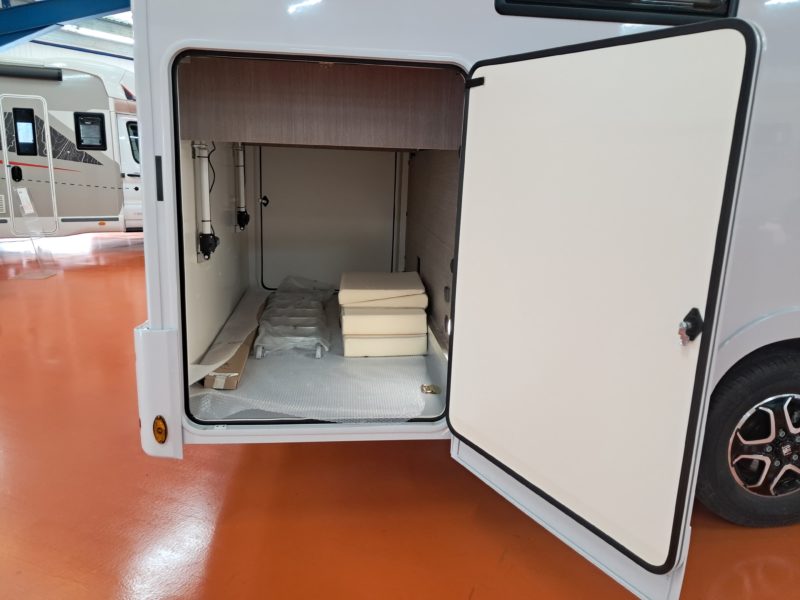 A la part posterior hi trobem un gran llit central regulable elèctricament en alçada, que permet adaptar l’espai del garatge segons les necessitats del viatge. A sota hi ha un garatge de gran capacitat, fins i tot amb espai per transportar un scooter.