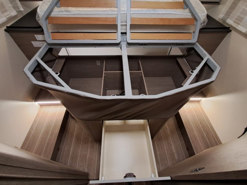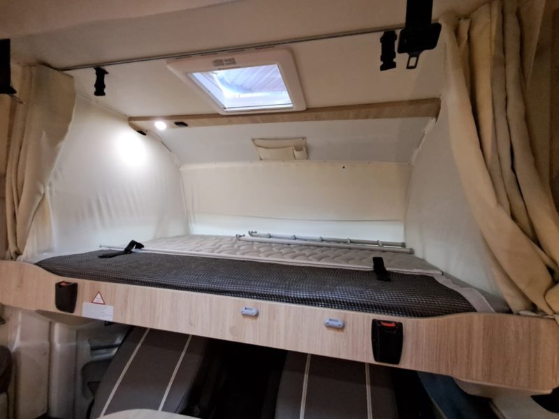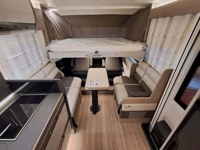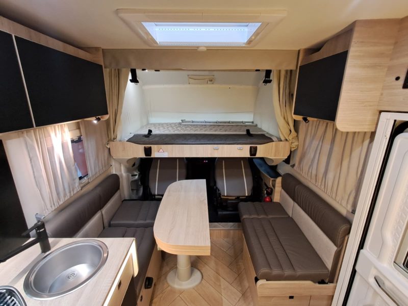 A més, a la part davantera incorpora una cama basculant elèctrica sobre la cabina, cosa que permet mantenir 4 places per dormir sense renunciar a l’espai del saló.