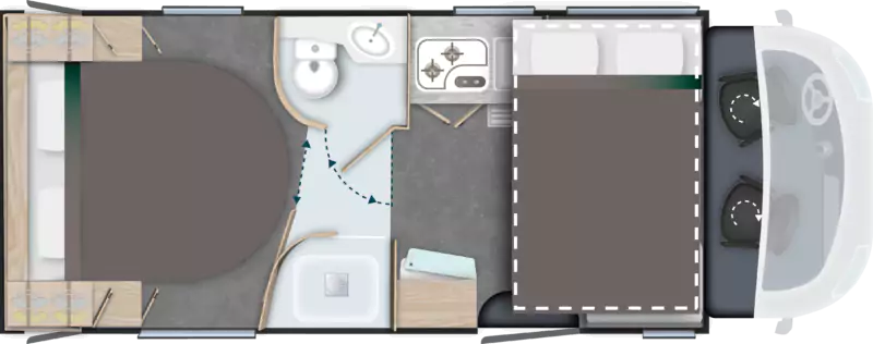 Totes dues comparteixen una de les distribucions més demandades actualment: llit central posterior, bany i dutxa independents, ampli saló face to face i llit basculant a la part davantera. Una configuració que ofereix comoditat, espai i gran versatilitat tant per a parelles com per a famílies.